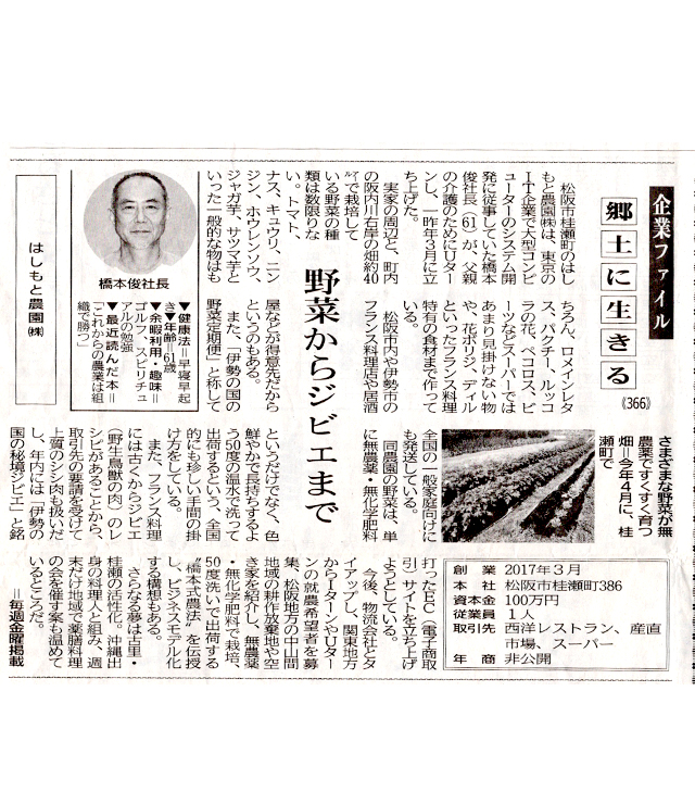 ご先祖様が残してくれた農地などの資産を、法人化による経営継承の円滑化を図ることで守り、食の安心・安全、高品質をお客様に提供し続ける。自社生産のこだわり野菜を中心にジュース等の加工品の製造・販売を実施し、ブランド化戦略を行う。